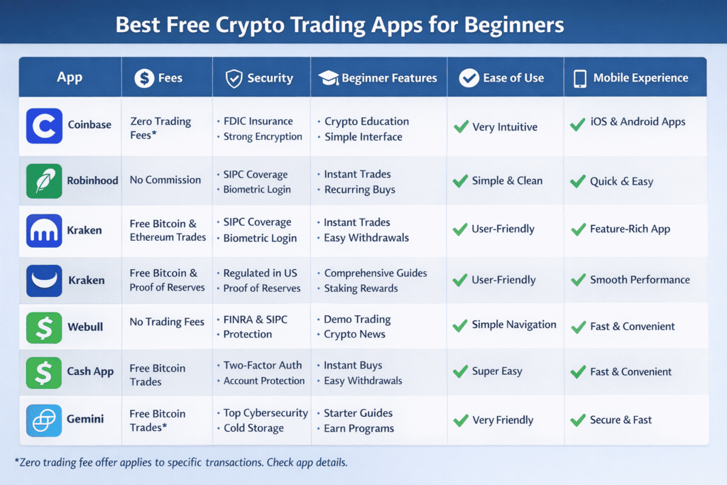 Here’s a quick comparison of some of the top free crypto trading apps for beginners in the USA, highlighting key features, fees, and usability.
