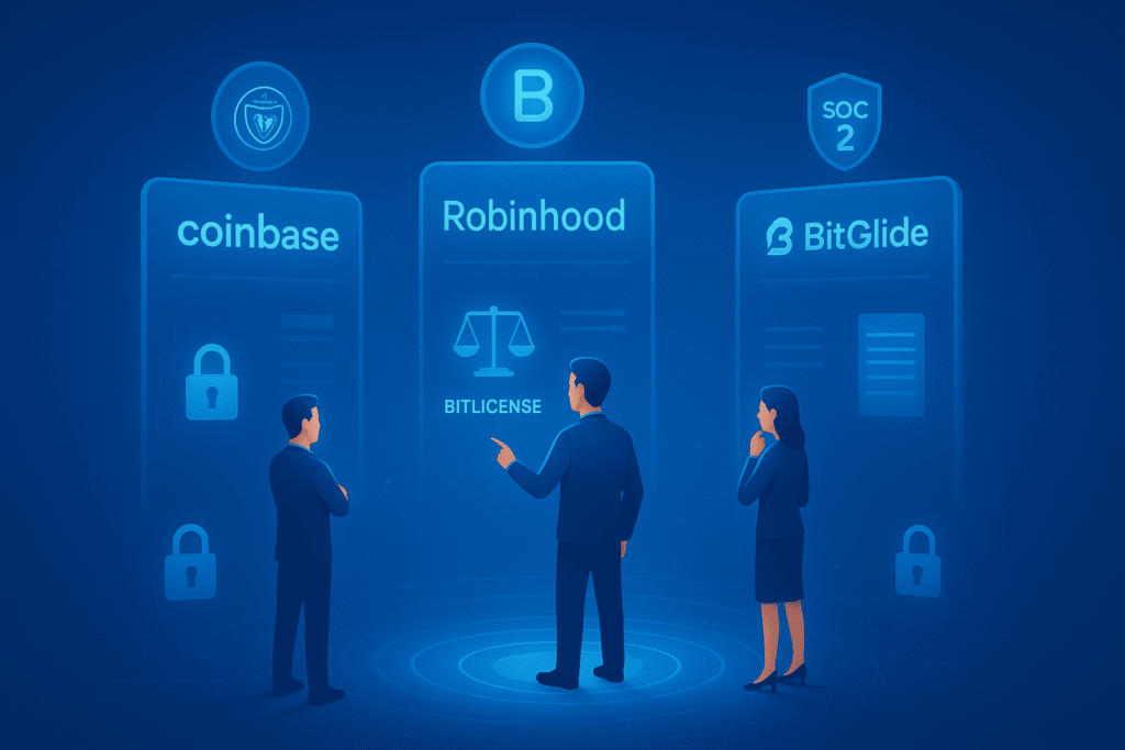 Regulatory compliance is one of the most important factors when comparing U.S. crypto trading apps. With increasing SEC scrutiny, stablecoin regulations, and state-by-state licensing requirements, users need platforms that operate transparently and follow strict guidelines. Here’s how Coinbase, Robinhood, and BitGlide compare in 2025.