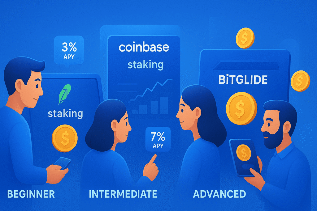 BitGlide offers competitive staking APYs, while Coinbase provides secure staking with popular coins. Robinhood offers simpler, lower-yield options.